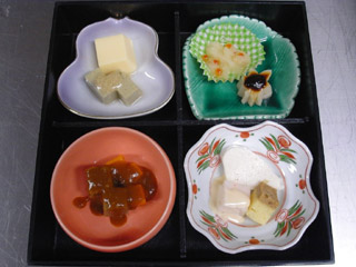 鱧の梅肉和え、いくらのおろし和え、茄子の胡麻浸し、里芋の田楽、西京焼き、太巻きやちらし寿司、中華おこわ、エビのチリマヨネーズ、ビーフシチュー、ミネストローネ、焼き豚、鮭のマリネ、茄子とトマトのグラタン、野菜チップス…などなど。