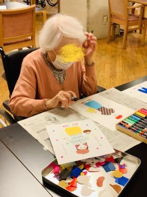 今月の美術活動はおしゃれの秋にちなみ、ファッションをテーマとした貼り絵を行いました。