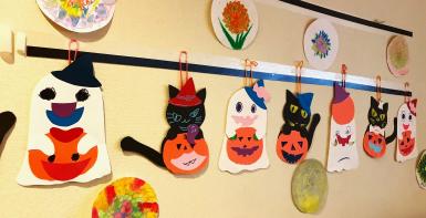 ハロウィンをモチーフに様々なパーツを組み合わせ、飾りを制作しました。