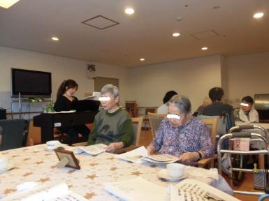 ピアノの生演奏に合わせて、春の歌や歌謡曲を歌いました。