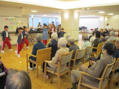 施設のある寿4丁目にダンススクールがあり、誕生日会に来ていただけないかとお願いをしたところ、可愛い生徒さん25名で来てくれました。