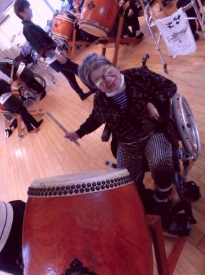 ボランティアさんと一緒にバチを持って、力強く太鼓を叩きます。