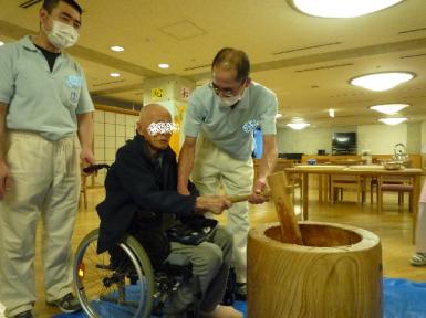 浴衣で施設にお越しいただいた皆さんですが、お餅をつく時はまわし姿になったので、さらに迫力がありました。