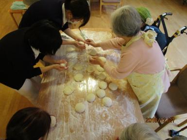受付や各フロアに飾る鏡餅を綺麗に成形するのは通所ご利用の女性ゲストにお手伝い頂きました。