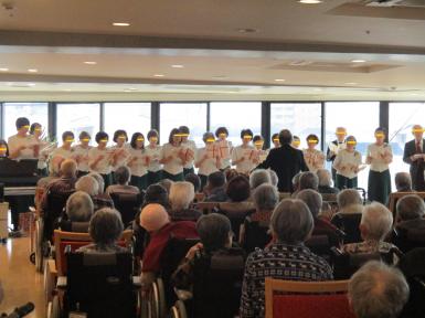 今回はコーラスのボランティアさんにお越しいただきまして、ジングルベルや日本の懐かしい民謡を歌っていただきました。団員の皆様の歌声は美しくそして大迫力でした。中には歌声を聞きながら口ずさんでいるゲストの方もいらっしゃいました。日本の童謡だけではなく外国の童謡等も曲目に含まれておりましたので、外国の雰囲気を感じるクリスマス会となりました。