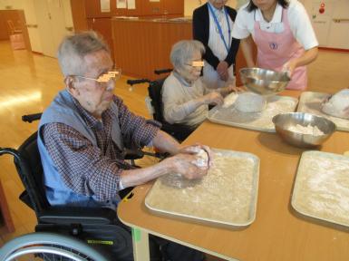 餅つきを始めると「ドンッドンッ」と力強い杵の音が聞こえ、、年に一度の光景にゲストも職員も興味深く見ていました。そして「よいしょっよいしょっ」と掛け声をかけ、餅つきの声援をしました。