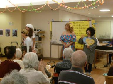 最後に、職員による出し物を行いましたが、こちらも2チームに分かれて、寸劇あったり、仮装しての替え歌あったりとこの日の為にゲストが笑顔になればと思い練習して来ました。その甲斐あって、沢山の笑顔を見ることが出来ました。