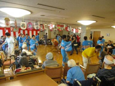 ゲームでは、普段おとなしい方のほうが、思いっきり元気に魚パンチゲームをしてたり、昼食では、いつも少食の方がおかわりして召し上がっていたり、盆踊りでは、最後にボランティアさんのご好意で太鼓を叩かせていただいたのですが、いつも難しい顔をしている方が、笑顔で楽しそうに太鼓を叩いていたりと、いつもと違うゲストの表情を垣間見ることが出来ました。