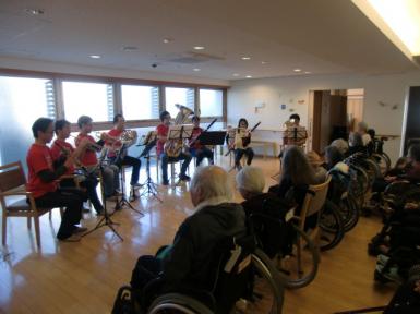 普段あまり目にする事の無い、大きなチューバや長細い楽器のファゴットなどで、ゲストの皆さんになじみのある曲を演奏していただきました。皆さん演奏に合わせて楽しそうに一緒に口ずさんでいました。最後にはゲストの皆さんの大好きな「ふるさと」で締めくくっていただきました。