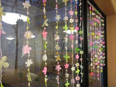 折り紙で作ったお花をたくさんつなげて、暖簾のようにしました。