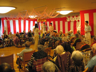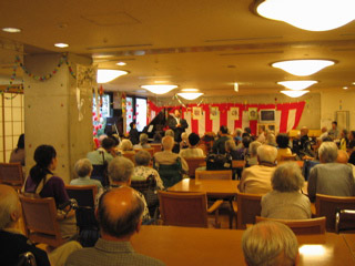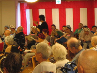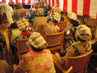 音楽療法士の指揮で、ベレー帽も晴れがましく。