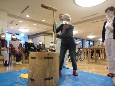 ゲストにも杵を持ってもらい、餅をついてもらいました。女性ゲストの中には