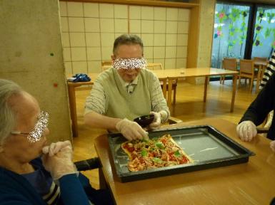 ※写真はトマトソースのピザにトッピングを載せている場面です。