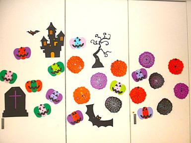 今月の飾りつくりは、ハロウィン用のおばけかぼちゃを作りました。