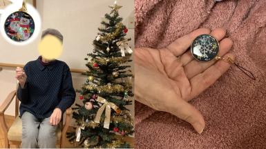 完成後は施設にあるツリーの前で作品をもって記念撮影を行いました。手に持たれる方もいれば「ブローチみたいにしたいね」と胸元にもってポーズをとって写真を撮られる方もいらっしゃいました。
